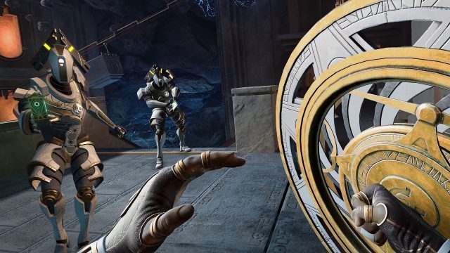 Virtually each a part of the sport (besides tutorial and goal pop-ups) feels natively designed for VR. Your map, as an illustration, might be projected into your hand by elevating your palm and holding the set off. Elevators aren’t activated with a button press however with an enormous floating dice that you just pull into place with a satisfying *clonk*. Weapons have ammo indicators constructed into their design (as an alternative of a quantity floating within the air). You are able to do stealth takedowns by sneaking behind an enemy and ripping out their ‘core’. As a substitute of doorways with hinges, each door within the sport is a sliding door (which is so significantly better for VR usability).